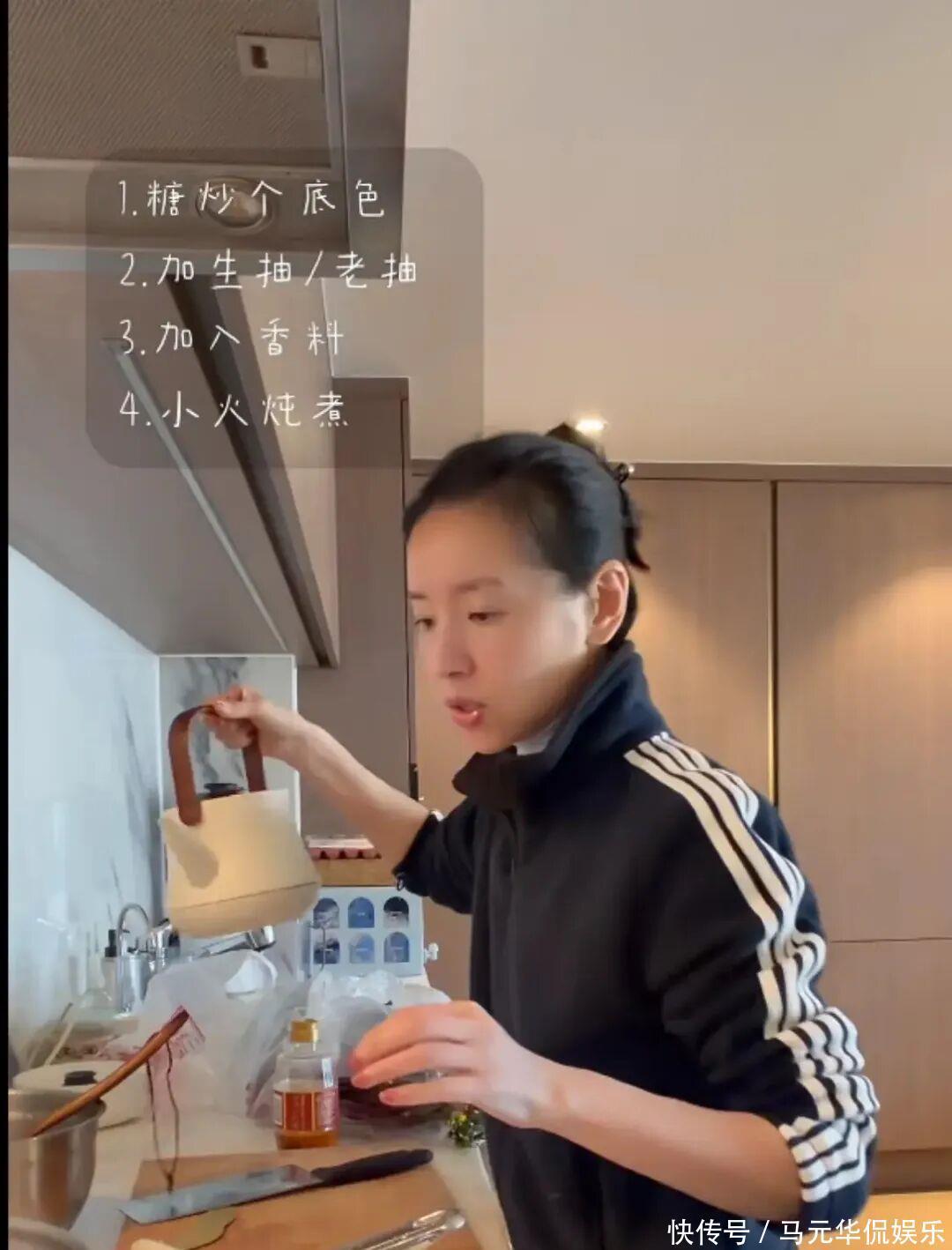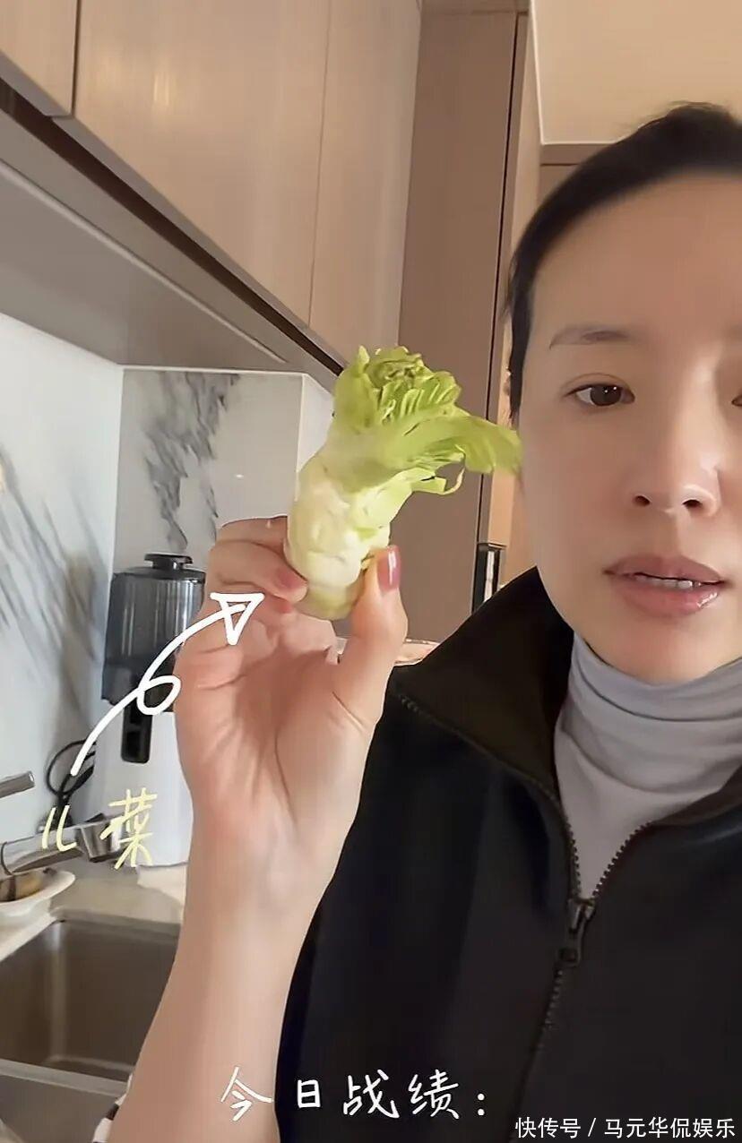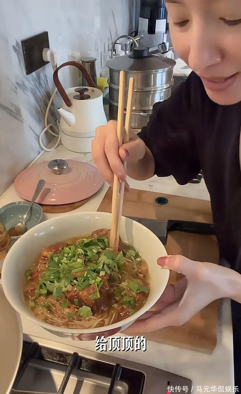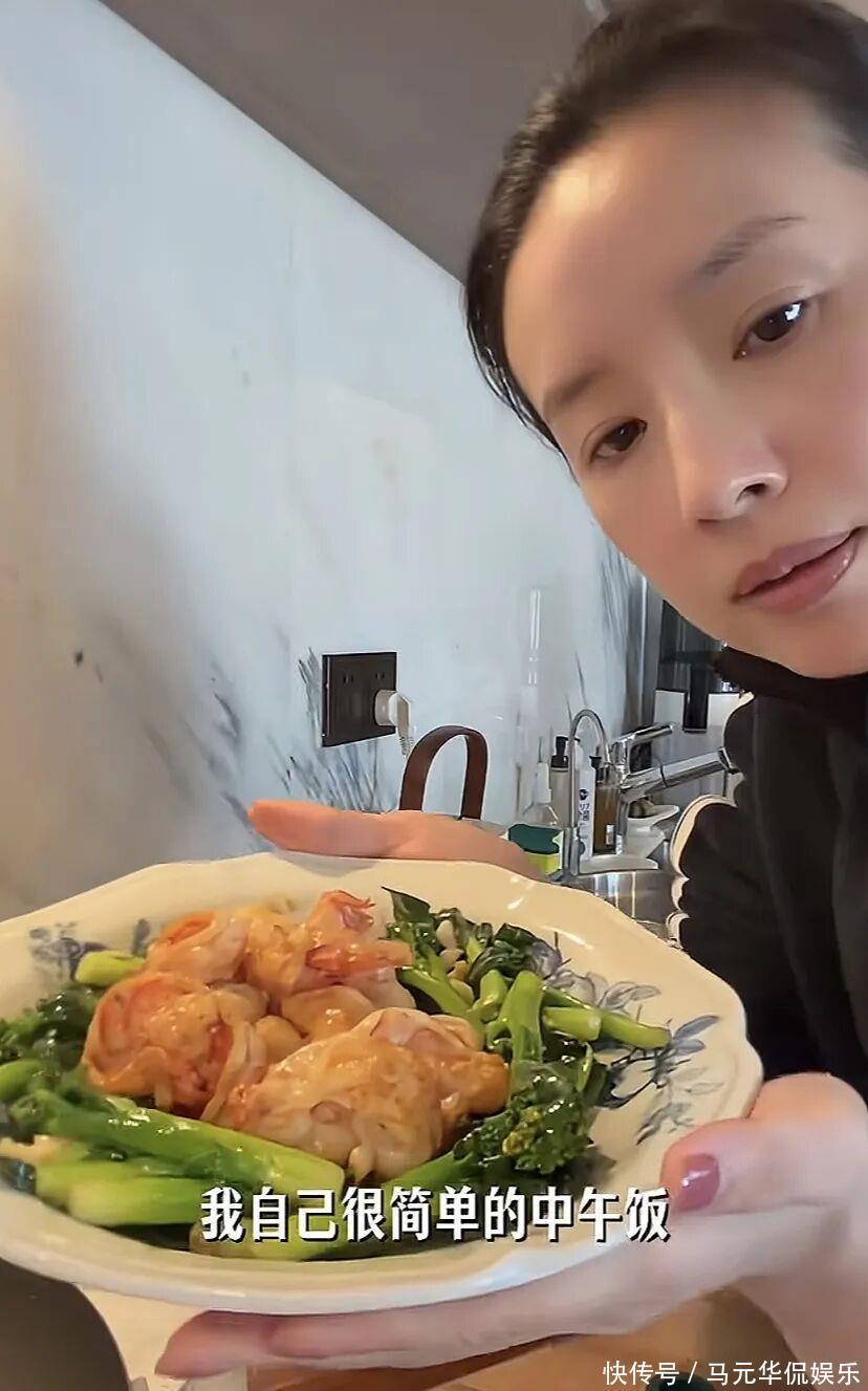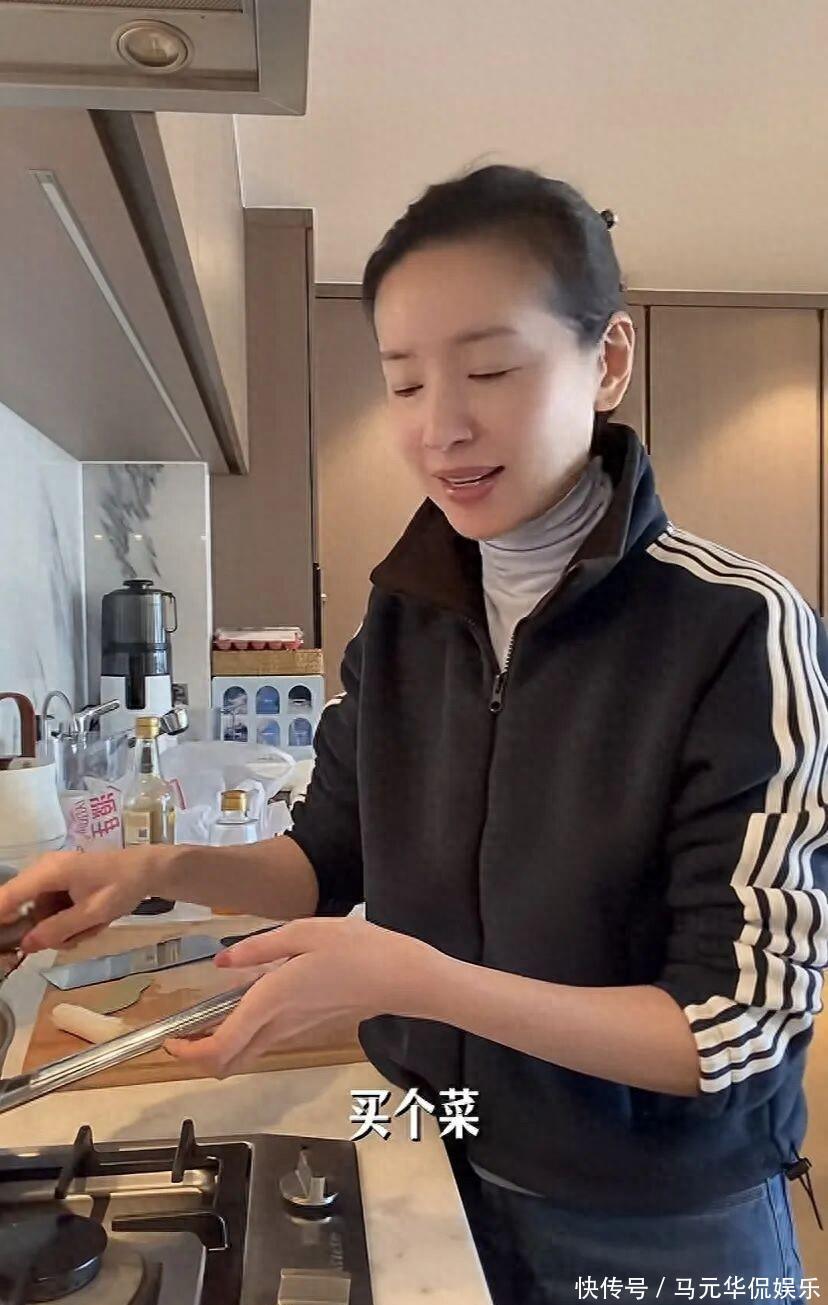 为了儿子读书,从大连搬到北京。日常行程就是围着学校和家转。如果有工作,那就换上职业装,对着镜头淡定优雅。如果休息,那就是“董大厨”“董保姆”“董司机”。一天里能切换好几个身份。送顶顶去上学,转身去早市买一堆新鲜蔬菜。手里提着的儿菜,很多人都不认识,小小一颗,还带点苦味。她却挑得认真,因为儿子爱吃。红烧牛肉、西红柿牛腩,营养要到位,量也不能少。不讲排场,只讲用心。家里暖气没打开,空调温度也够不到理想。11月的北京,冷得刺骨,她穿着高领加外套做饭。不是没钱暖气,而是习惯节制生活。豪宅的厨房特别大。两灶台,一边炒菜,一边炖肉。餐具调料摆在操作台上,顺手又整洁。自己一个人吃,中午简单一些。剩下的虾加点青菜,翻炒一下就是午餐。哪怕忙到没人陪吃,她还是认真对待每一顿饭。一个人的饭桌,也能有烟火气。