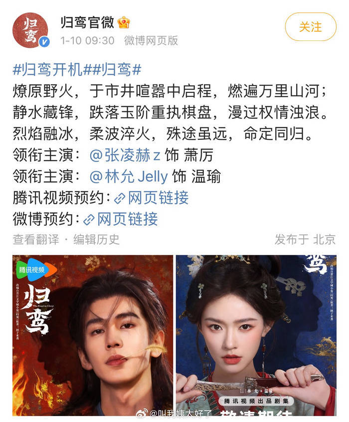 除了造型吸睛,片场互动也甜度爆表。有网友拍到张凌赫在烈日下贴心为林允挡太阳,两人同框时眼神拉丝。还有一场背戏,张凌赫背起林允时不小心摔倒,两人互相道歉的样子羞涩又可爱。更有趣的是,拍摄时一只蜜蜂误触张凌赫嘴唇,被网友调侃成《归鸾》第一场吻戏,还衍生出“内娱香妃体质”的段子,逗乐众人。