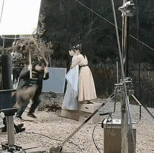 在拍摄某部古装剧中,男主角因多次无法抱起来女主,最终没办法只能用梯子完成。